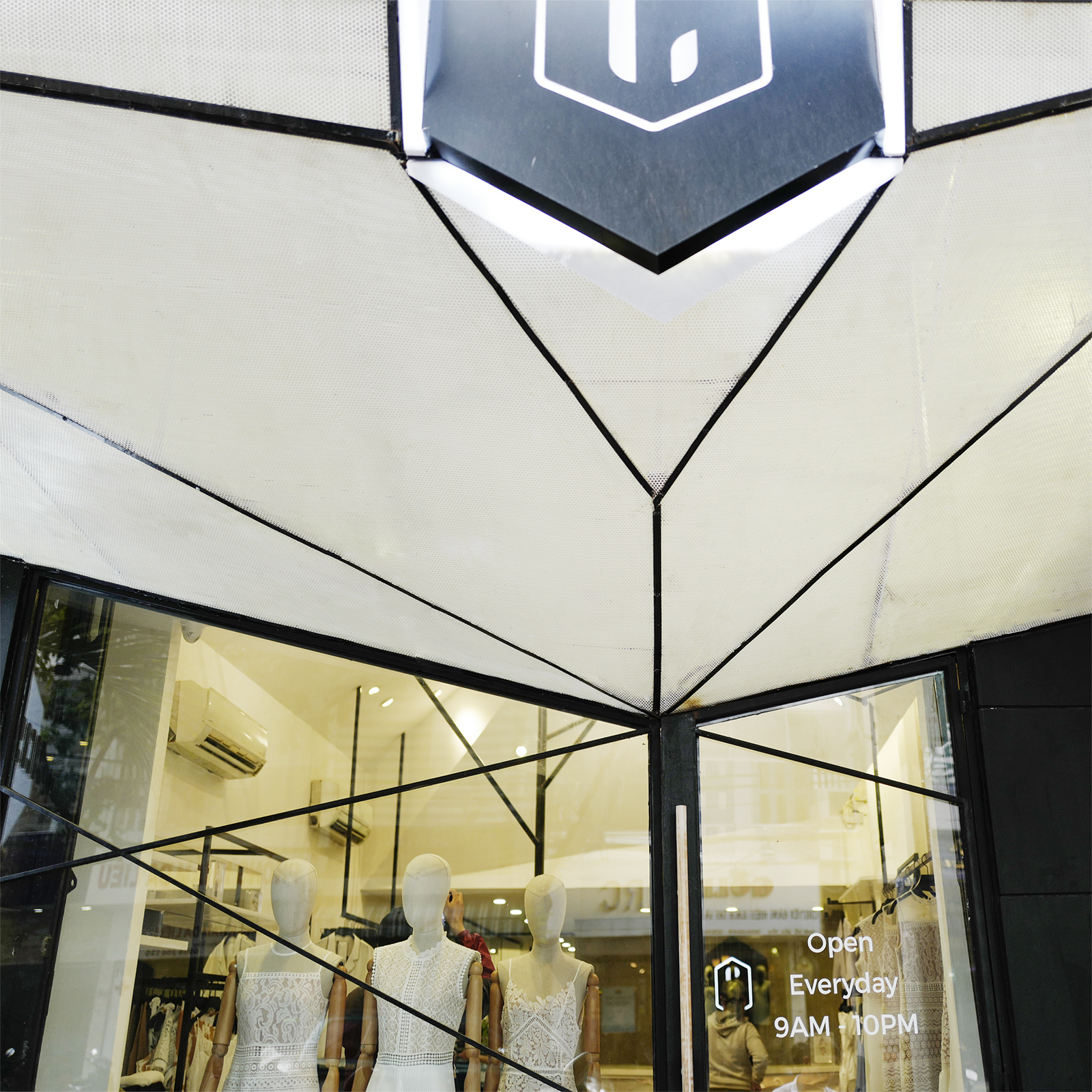 Để giải quyết cả 3 vấn đề, trong một mặt bằng quá nhỏ, chúng tôi tập trung nhiều về các giải pháp hỗ trợ lẫn nhau. Phần trần nhà được xử lý để vừa gây ấn tượng, vừa tận dụng cao độ của thông tầng, và quan trọng là trở thành giải pháp thông gió cho căn phòng bên trên. Mặt tiền được tạo ra với chất liệu thoáng cộng với thiết kế rỗng đưa ra phía trước, hỗ trợ thông gió lại làm công trình nổi bật và dễ nhận diện hơn. Cục nóng máy lạnh giấu trong mặt tiền, trở thành giải pháp đối lưu áp suất, tăng cường trao đổi không khí của phần nhà ở phía sau. Cuối cùng là hệ tủ trữ đồ kết hợp gương soi và khu thử đồ khiến khu vực này trở thành một điểm nhấn thú vị cho cả cửa hàng. Gần như mọi vấn đề đều được giải quyết sau một thời gian đau đầu tìm và thử nghiệm các phương án.